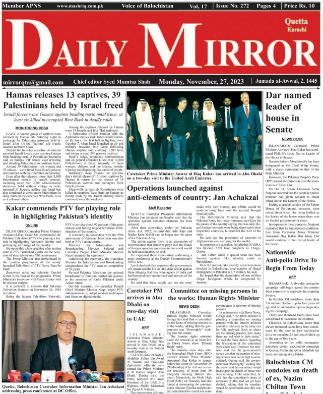 Daily Mirror Quetta. 27-11-2023 On نومبر 27, 2023 Share Daily Mirror Quetta Share FacebookTwitterGoogle+ReddItWhatsAppPinterestEmail