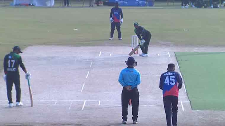 نیپال بلائنڈ نے پہلی اننگز میں 18 اوورز کے میچ میں 5 وکٹوں کے نقصان پر 100 رنز بنائے، نیپال بلائنڈ کی جانب سے بھارت ٹھپا نے 39 رنز کی اننگز کھیلی۔