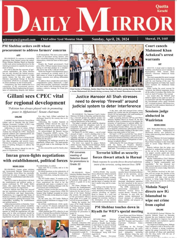 Daily Mirror Quetta. 28-04-2024 – Daily Mashriq Newspaper Quetta