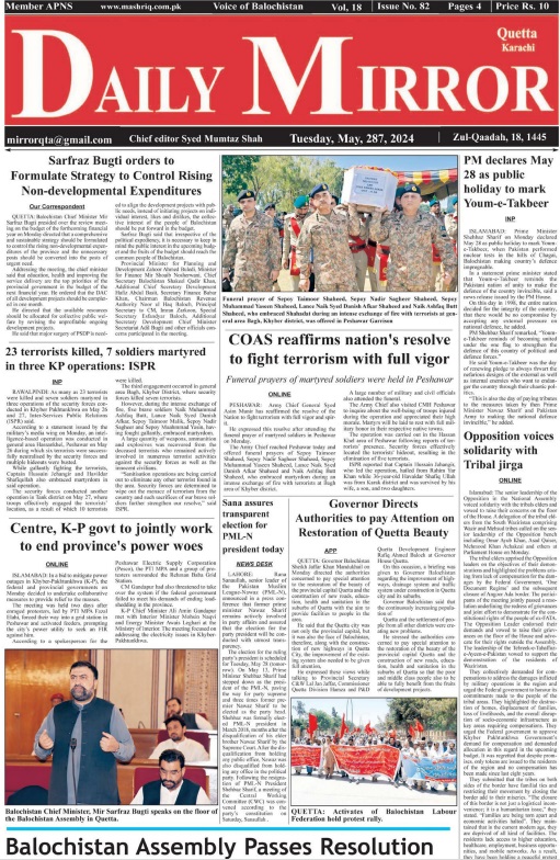 Daily Mirror Quetta. 28-05-2024 On مئی 28, 2024 Share Daily Mirror Quetta Share FacebookTwitterGoogle+ReddItWhatsAppPinterestEmail