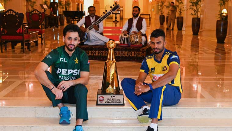 پاکستان اور سری لنکا کے کپتانوں نے ٹرافی کے ساتھ تصاویر بنوائیں، ٹرائی سیریز کا فائنل ہفتہ کو پاکستان اور سری لنکا کے درمیان کھیلا جائے گا۔