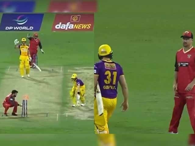 وائرل ویڈیو میں دیکھا گیا کہ میچ کے دوران شارجہ واریئرز کے بلےباز ڈیزرٹ وائپرز کے لیگ اسپنر شاداب خان کی گیند کو سامنے کی طرف کھیلتے ہیں لیکن گیند نان اسٹرائیکر پر کھڑے مارٹن گپٹل کے ہاتھ پر لگ جاتی ہے اور تھوڑا سا آگے نکلتے ہوئے گر جاتے ہیں۔