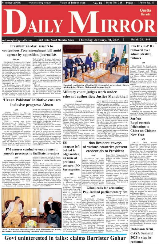 Daily Mirror Quetta. 30-01-2025 On جنوری 29, 2025 Share Daily Mirror Quett Share FacebookTwitterGoogle+ReddItWhatsAppPinterestEmail