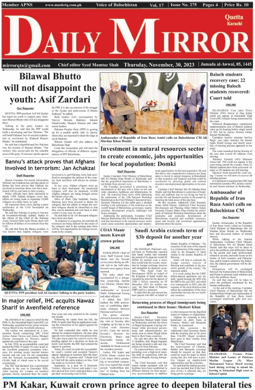 Daily Mirror Quetta. 30-11-2023 On نومبر 30, 2023 Share Daily Mirror Quetta Share FacebookTwitterGoogle+ReddItWhatsAppPinterestEmail