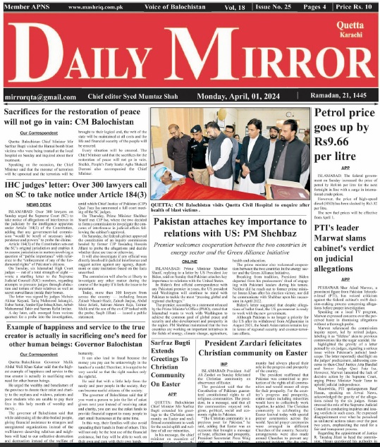 Daily Mirror Quetta. 01-04-2024 On مارچ 31, 2024 Share Daily Mirror Quetta Share FacebookTwitterGoogle+ReddItWhatsAppPinterestEmail