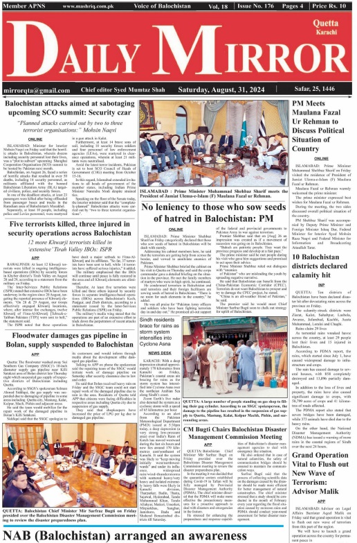 Daily Mirror Quetta. 31-08-2024 – Daily Mashriq Newspaper Quetta